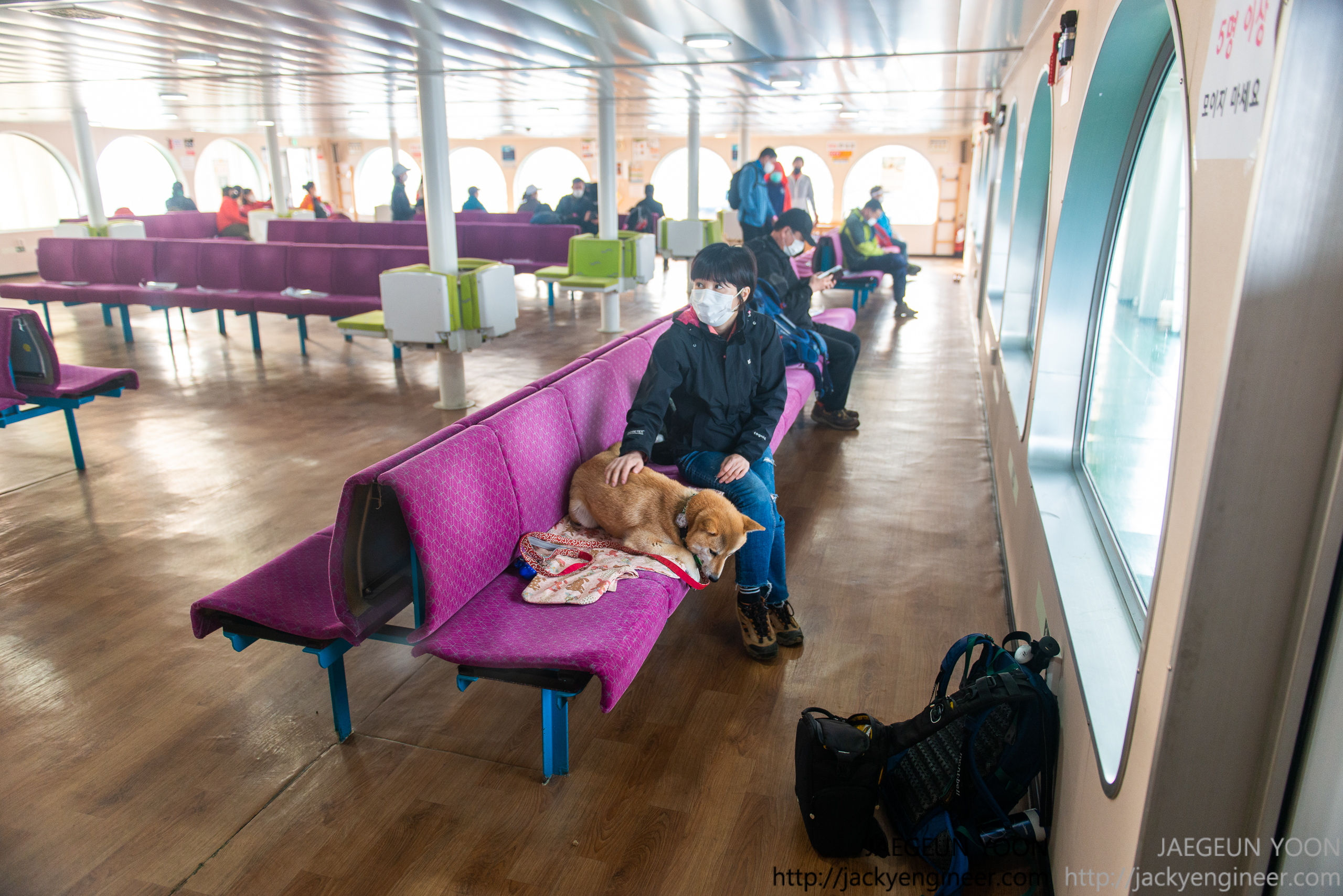 장봉도로 이동하는 배편에 승선하고 나면 여러명이 사용하는 벤치에 앉아 이동을 해야 합니다. 혹시나 털 때문에 다른 다른분들에게 불편을 끼칠까봐 항상 가지고 다니는 바닥 매트를 깔고 햇살이를 올려뒀습니다. 가족을 바닥에 내려두는건 왠지 맘이..T_T