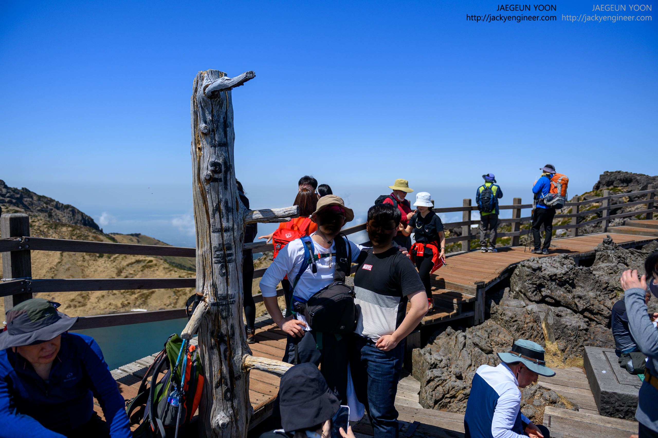 정상석 앞에서 사진 한장 남기려고 줄지어 기다리는 등산객들..