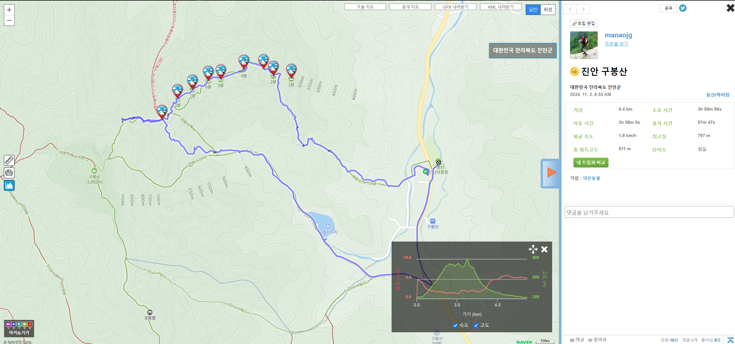 손목 부상 후 오랜 깁스 생활을 마치고, 운동 복귀를 기념하여 진안의 구봉산을 찾았다. 편도 200km의 경부고속도로 장거리 이동과 예상 외 난이도 있는 등산 코스로 인해 체력적으로 쉽지 않은 하루였음.. 😅